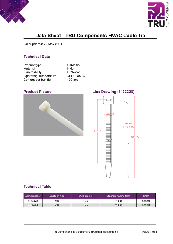 TC-12533312 TRU COMPONENTS TC-12533312 Opaska kablowa 280 mm 12.7 mm naturalny biały HV...
