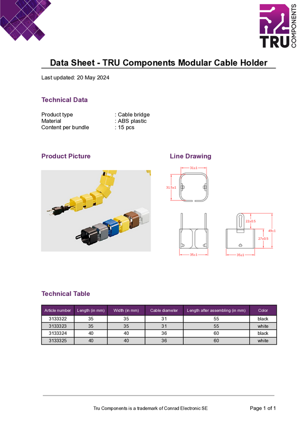 TC-12533288 TRU COMPONENTS Modułowy uchwyt na kabel TC-12533288 tworzywo ABS czarny 35...