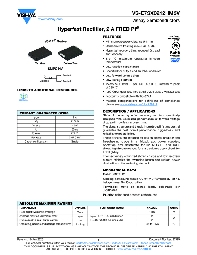 VS-E7SX0212HM3V Hyperfast Rectifier, 2 A FRED Pt®