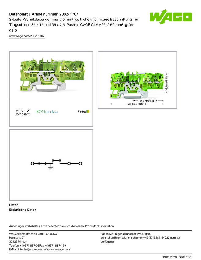 Terminal przewodzący, ochronny, potrójny WAGO 2002-1707 zacisk push-in 50 szt.