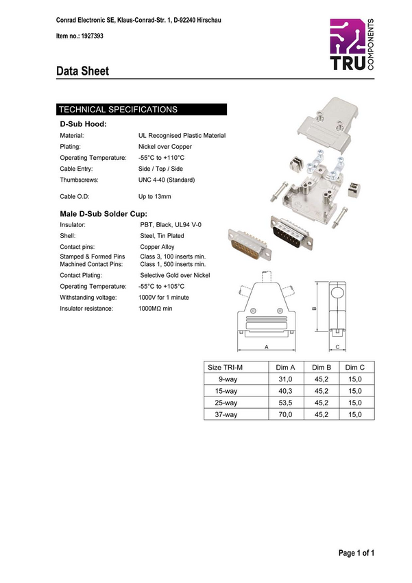 7709572 TRU COMPONENTS 7709572 Zestaw listew męskich D-Sub TCTRIM09DBPK, rzędy: 2,...