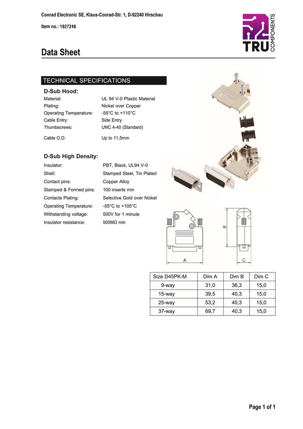 TRU COMPONENTS 7709264 Zestaw listew żeńskich D-Sub TCD45PKM15HDS26K, rzędy: 3, styki: 26, 45 °, 1 szt.