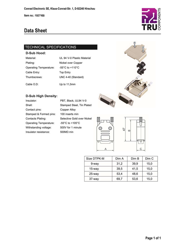 7708672-SR TRU COMPONENTS 7708672-SR Zestaw listew męskich D-Sub TCDTPKM09HDP15K, rzęd...