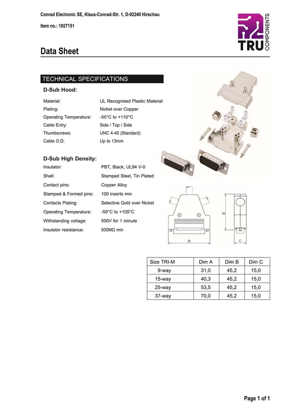 TRU COMPONENTS 7708604 Zestaw listew męskich D-Sub TCTRIM09HDP15K, rzędy: 3, styki: 15, 180 °, 1 szt.