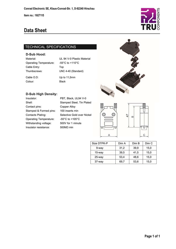 TRU COMPONENTS 7708460 Zestaw listew żeńskich D-Sub TCDTPKP25HDS44K, rzędy: 3, styki: 44, 180 °, 1 szt.
