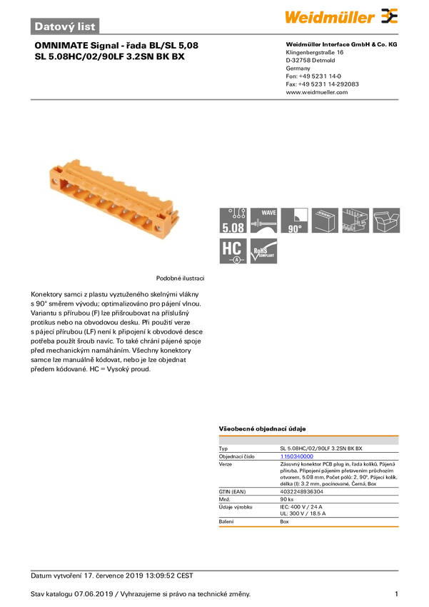 Weidmüller 1150340000 Obudowa złącza pin męskiego na PCB LP SV SL 5.08HC0290LF 3.2SN BX, wire-to-board, piny: 2, 24 A, 9
