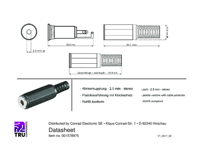 1578975 TRU COMPONENTS 1578975 Złącze męskie jack 2,5 mm, niklowany, 1 szt.