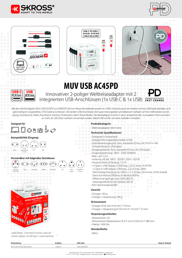 1302975 Adapter podróżny Skross 1302975 MUV AC45PD