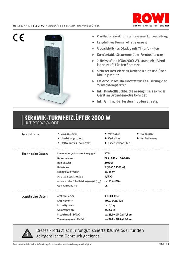 1 03 03 0356 ROWI 1 03 03 0356 Termowentylator ceramiczny HKT 2000/2/4 ODF 60 m³ biały,...