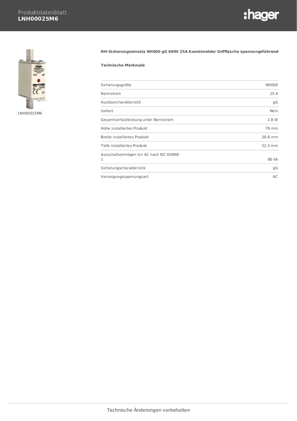 LNH00025M6 Hager LNH00025M6 Bezpiecznik NH 25 A 3 szt.