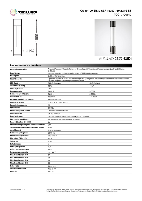 Trilux CS19 100SB3L 7726140 Reflektor ogrodowy LED 19 W Kolor LED: ciepła biel