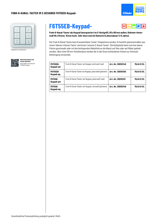 30055148 F6T55EB-Keypad-wg Eltako bezprzewodowy Przycisk nadtynkowy Zasięg maksymaln...