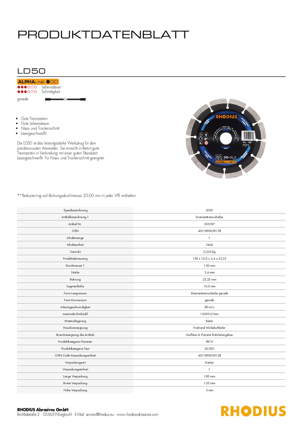 Tarcza tnąca diamentowa Rhodius LD50 303187 1 szt.