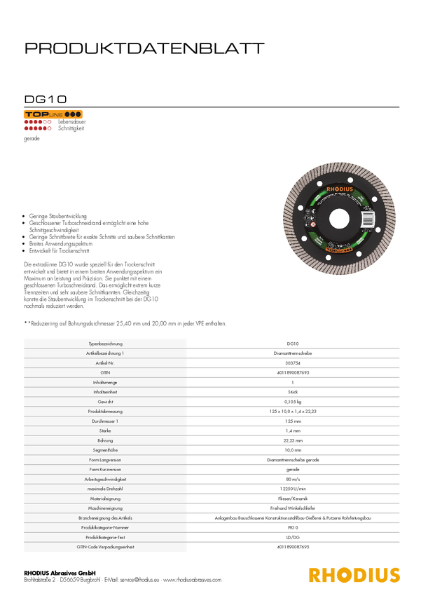 Tarcza tnąca diamentowa Rhodius DG10 303754 1 szt.