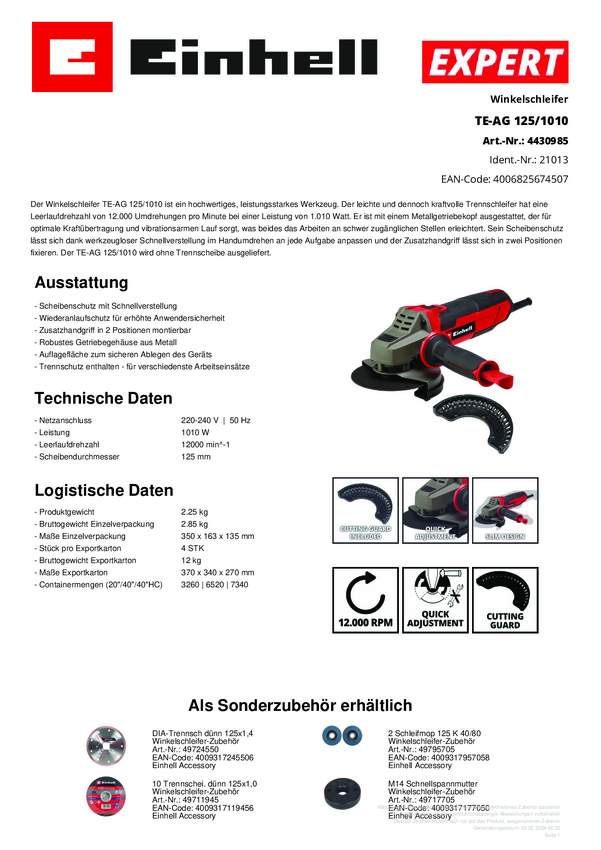 4430985 Szlifierka kątowa Einhell TE-AG 125/1010 4430985 1010 W