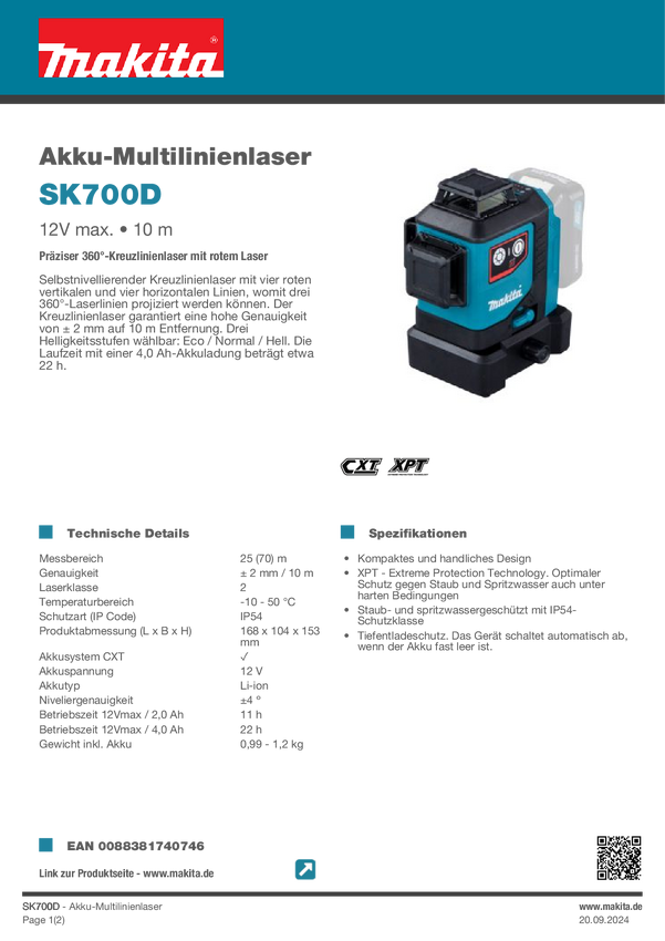 SK700D Laser krzyżowy Makita SK700D SK700D Maksymalny zasięg: 25 m