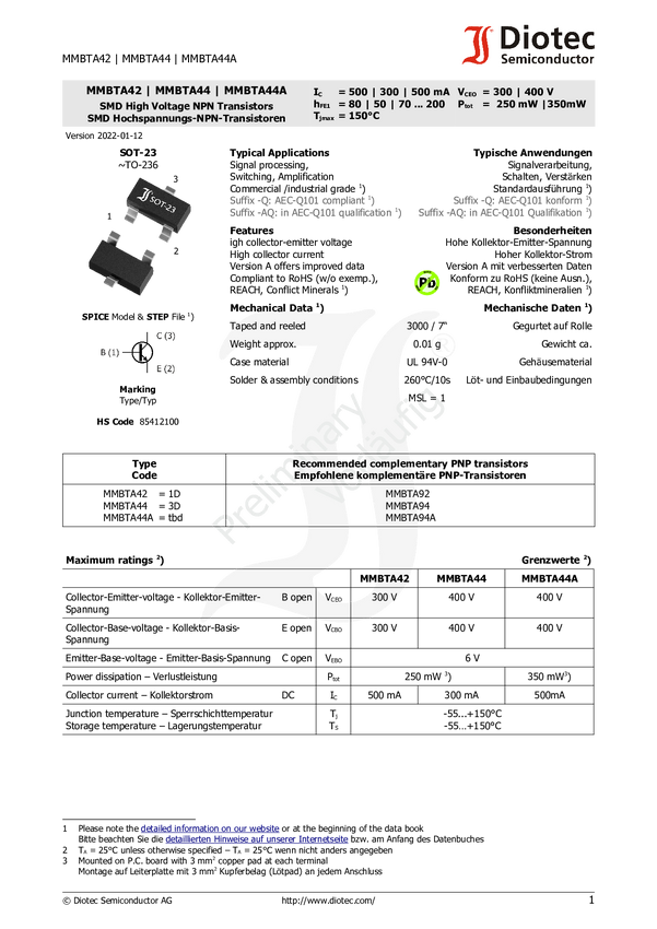 MMBTA42 Diotec MMBTA42 Tranzystor (BJT) - dykretny 1 szt.