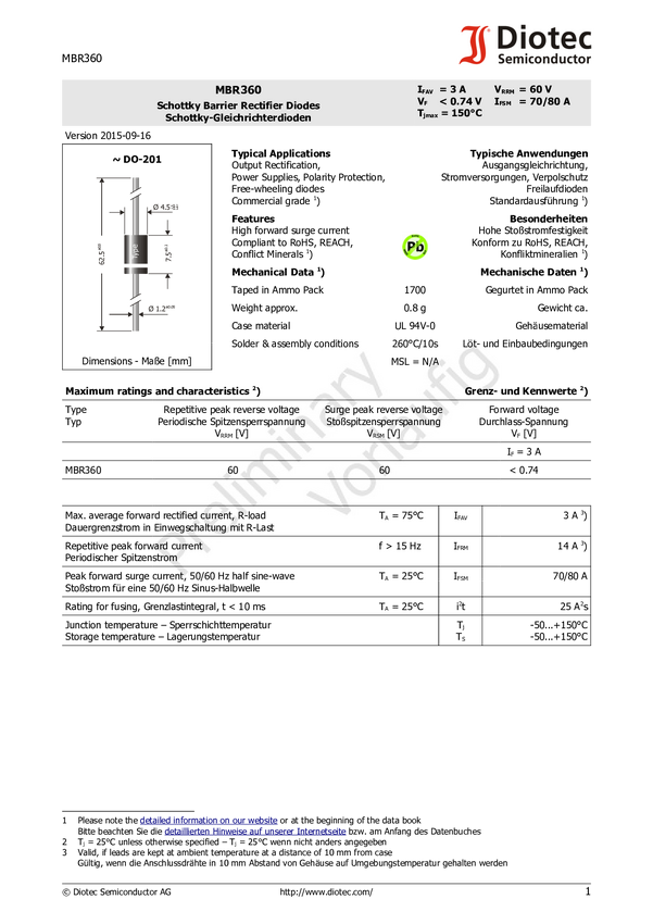 Schottky, DO-201, 60V, 3A Diotec MBR360 N/A N/A N/A