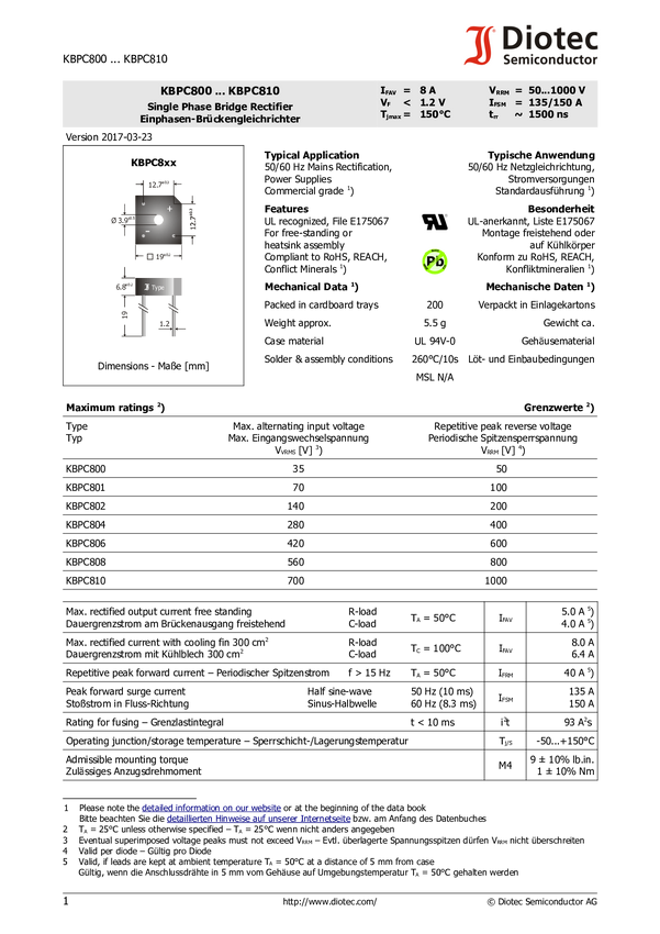 KBPC800 Diotec KBPC800 Prostownik mostkowy KBPC8-PB10 50 V 4 A