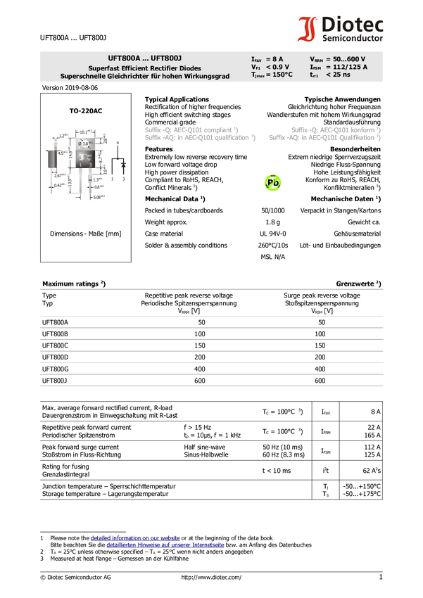 Dioda prostownicza Diotec UFT800B N/A N/A