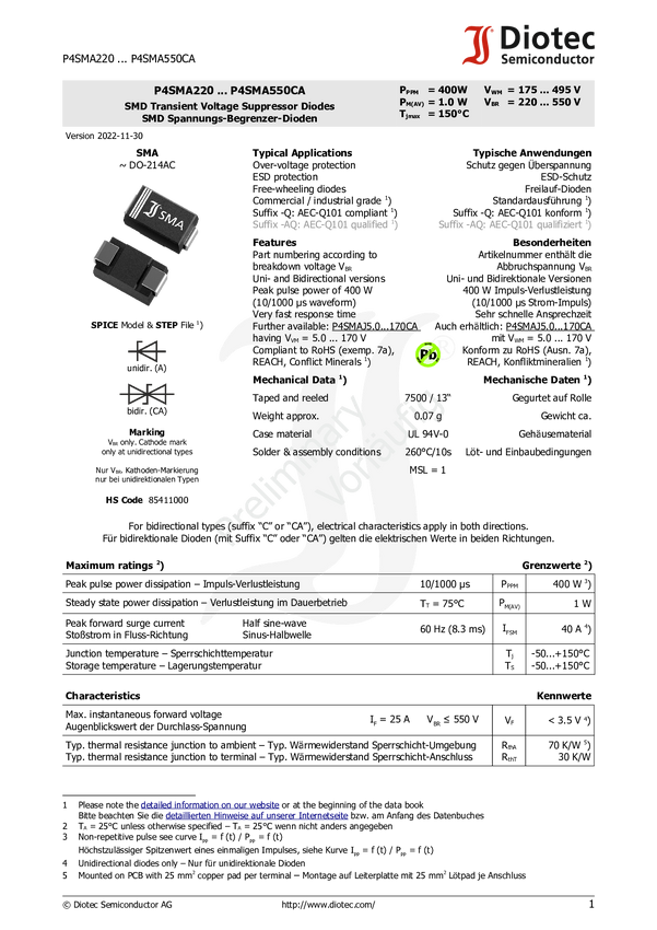 P4SMA220C Diotec Dioda TVS P4SMA220C DO-214AC 242 V