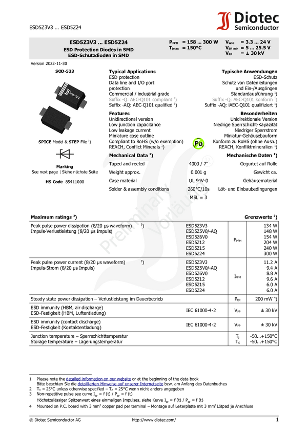 ESD5Z3V3 Diotec ESD Dioda ESD ESD5Z3V3 SOD-523 8.40 V