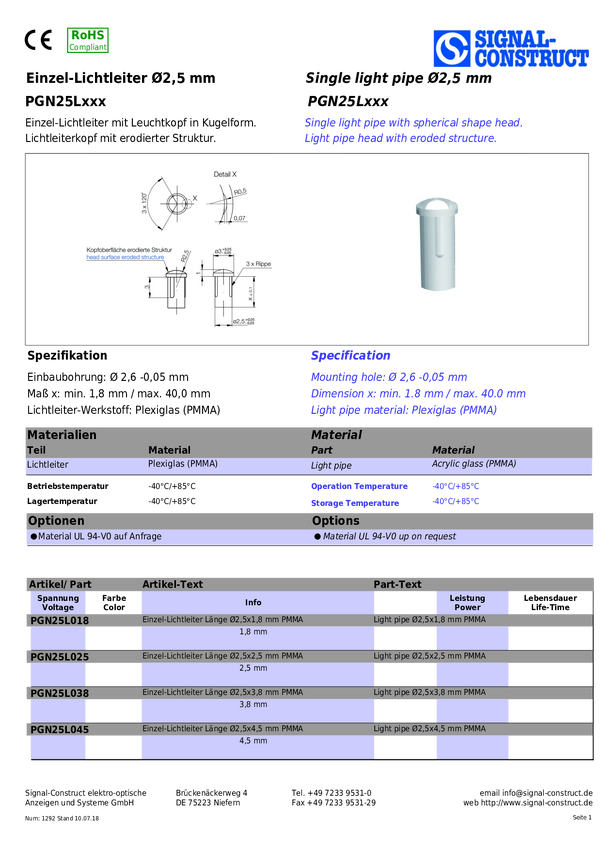 PGN25L145 Pojedynczy światłowód Ø2,5 mm Signal Construct PGN25L145