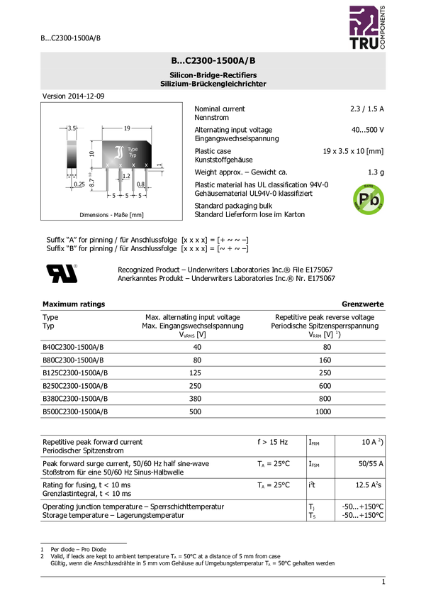 1581989 Prostownik mostkowy TRU COMPONENTS TC-B250C1500B, 600 V, 2.3 A