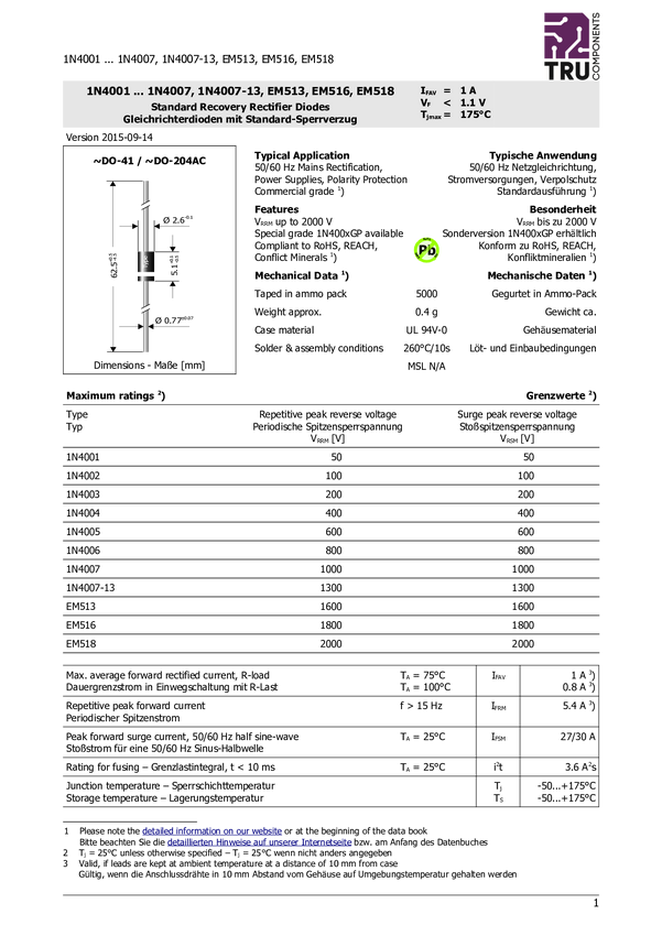 1581844 Dioda 1N4006 800V/1A TRU COMPONENTS 1581844 N/A N/A