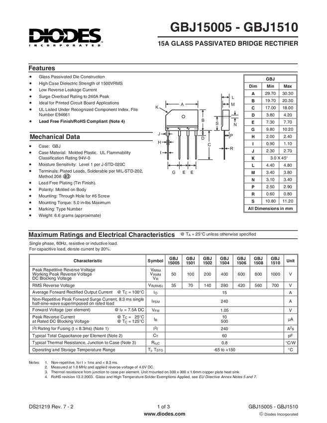DIODES Incorporated GBJ1506-F Prostownik mostkowy GBJ 600 V 15 A Jednofazowy