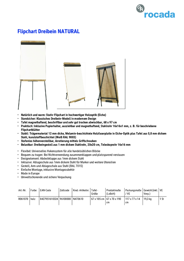 Flipchart Rocada NAT0610 (S x W) 700 mm x 1900 mm drewno, dębowy, biały (RAL 9003)