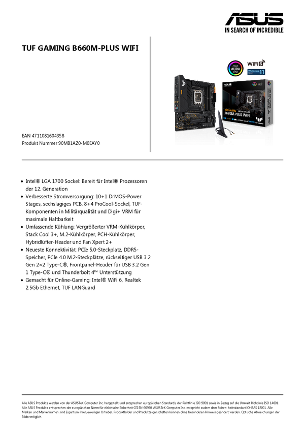 90MB1AZ0-M0EAY0 Płyta główna Asus TUF GAMING B660M-PLUS WIFI Intel® 1700 Micro-ATX Intel® B...