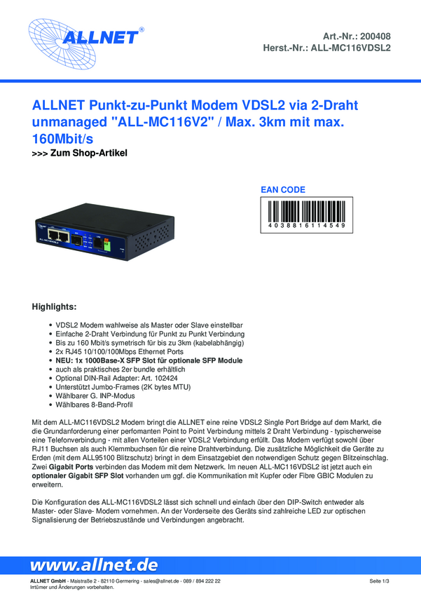 A200408 Modem punkt-punkt ALLNET VDSL2 przez 2-żyłowy niezarządzany „ALL-MC116V2” /...