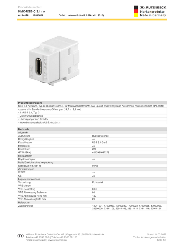 17010657 Rutenbeck KMK-USB-C 3.1 rw Adapter 1 szt.