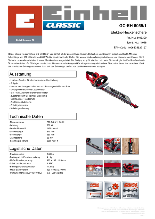 3403320 Einhell GC-EH 6055/1 elektryczny Nożyce do żywopłotu z kratką 600 W 610 mm