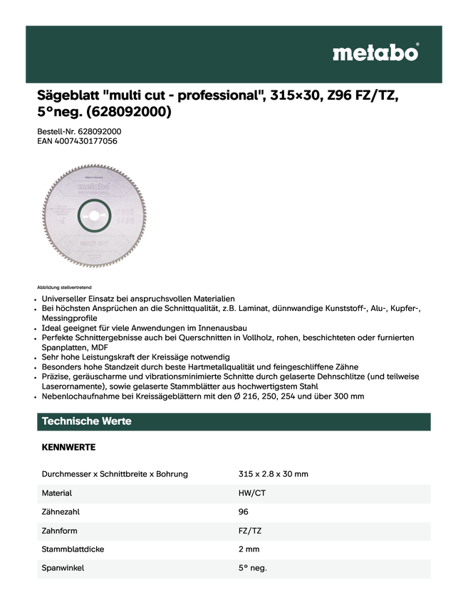 628092000 Tarcza do piły tarczowej „multi cut” HW/CT 315x30 96 FZ/TR Metabo HW/CT 315...