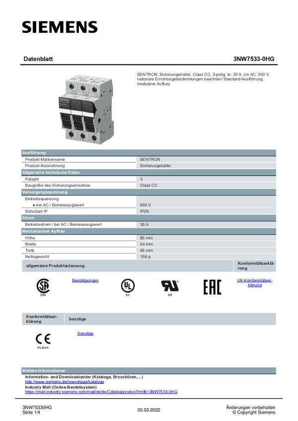 3NW75330HG Siemens 3NW75330HG Uchwyt bezpiecznika 30 A 600 V/AC 4 szt.