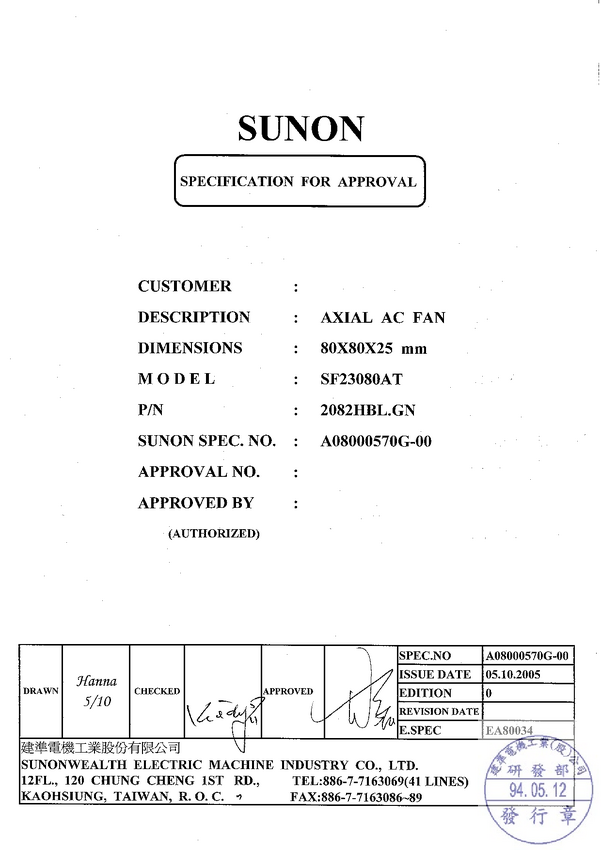 SF23080AT2082HBL Wentylator osiowy Sunon SF23080AT2082HBL, 230 V/AC, 30.57 m³/h, (D x S x W)...