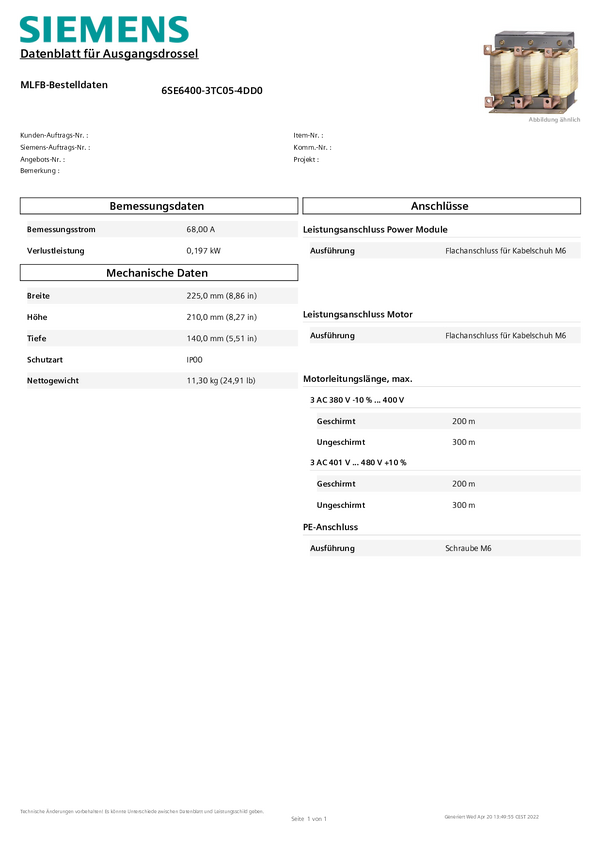 6SE64003TC054DD0 Dławik Siemens 6SE6400-3TC05-4DD0 6SE64003TC054DD0 68 A 1 szt.