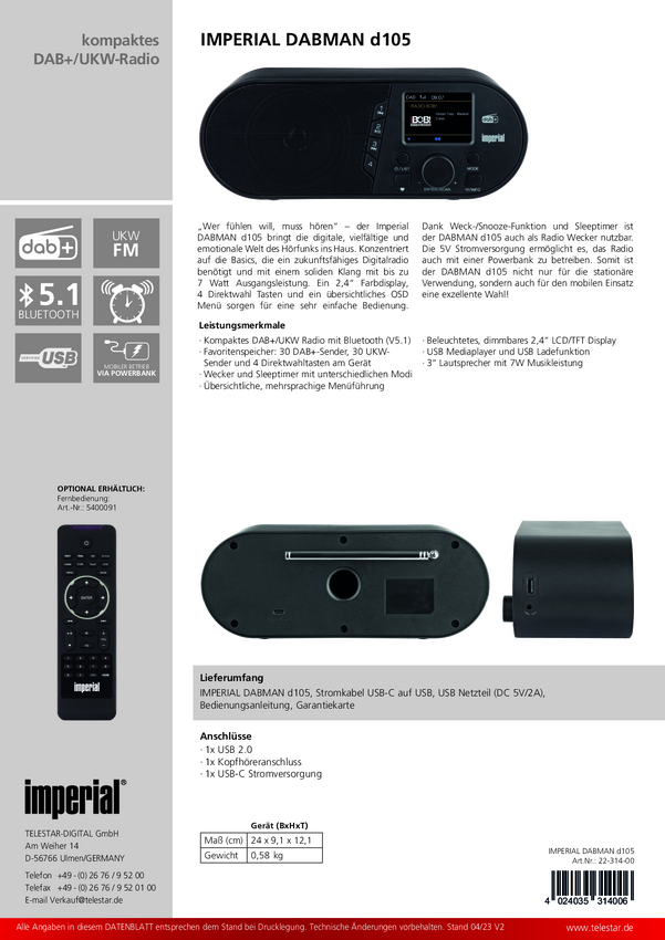 22-314-00 Radio Imperial DABMAN d105 DAB+, fale metrowe (VHF), FM czarny