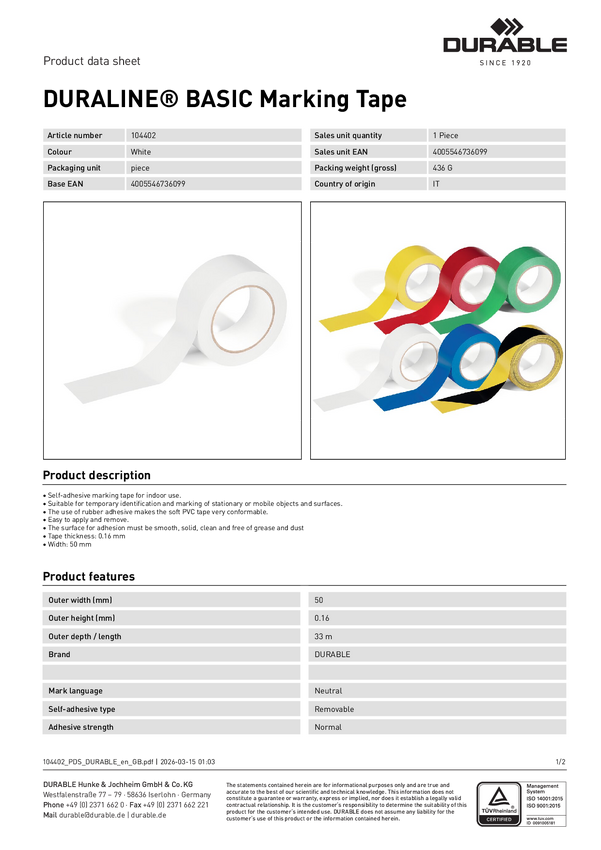 Durable 104402 Durable 104402 Taśma znakująca DURABLE DURALINE® BASIC 50/016 biały 33 m (D x S) 33 m x 50 mm biały 33 m
