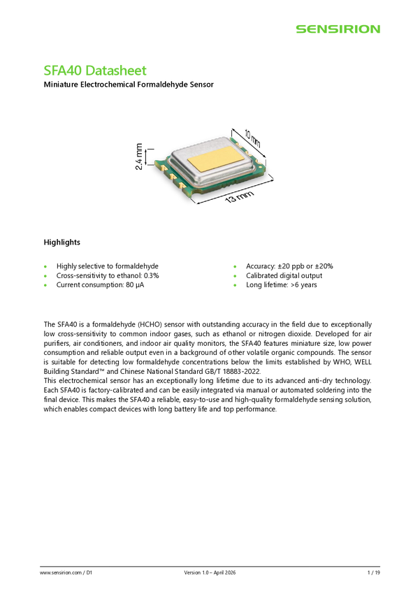 SFA40 - 适用于室内空气质量应用的微型、低功耗甲醛传感器
