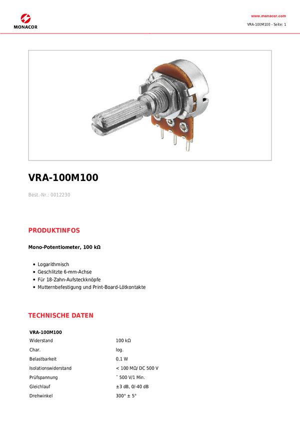 Monacor 0012230 VRA-100M100 Potencjometr obrotowy 0.1 W 100 kΩ 1 szt.