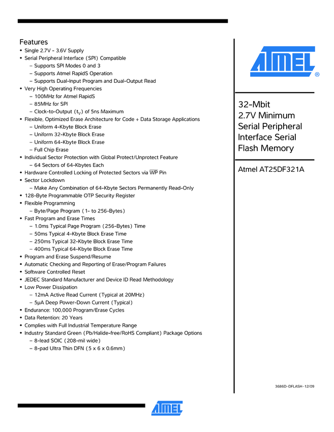 AT25DF321A 32-Mbit 2.7V Minimum SPI Serial Flash Memory