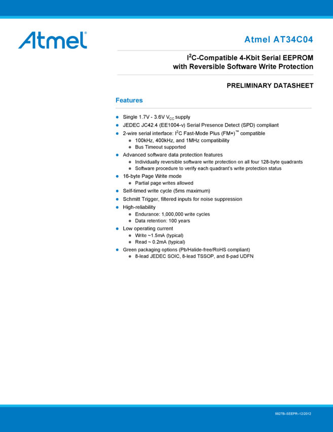 AT34C04 4Kb I²C-compatible 2-wire Serial EEPROM with Reversible Software Write Prot...