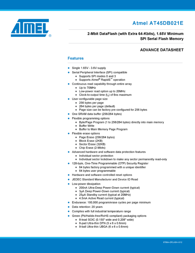 AT45DB021E 2-Mbit 1.65V Minimum DataFlash Memory