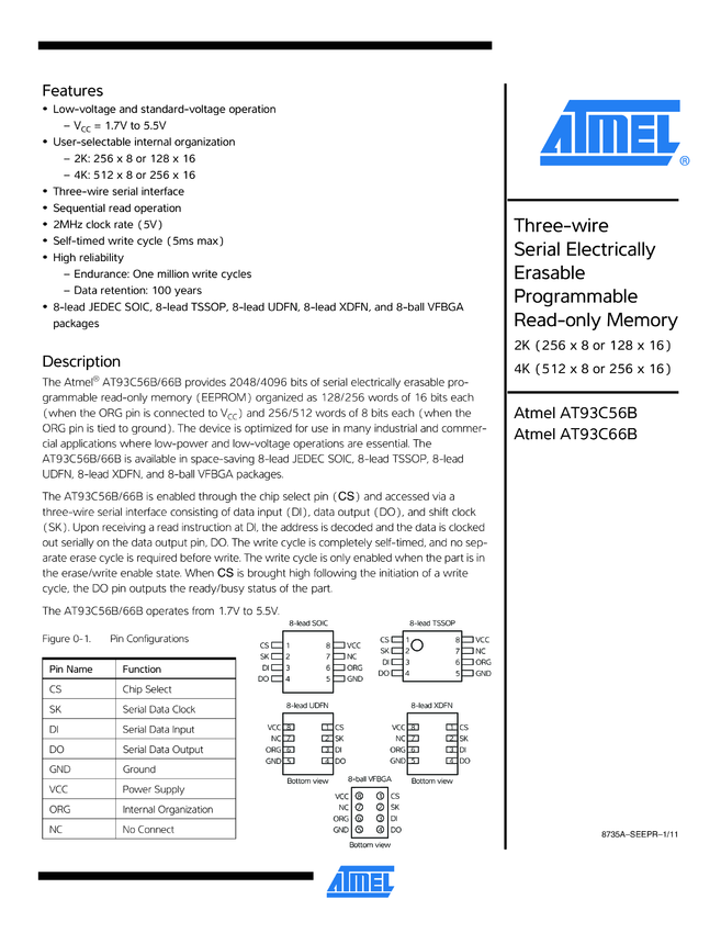 AT93C56B 2-Kbit Microwire-compatible 3-wire Serial EEPROM