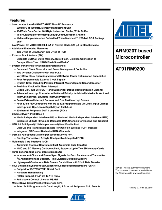 AT91RM9200 ARM920T Embedded Microprocessor Unit with USB host and Device, Ethernet, 20...