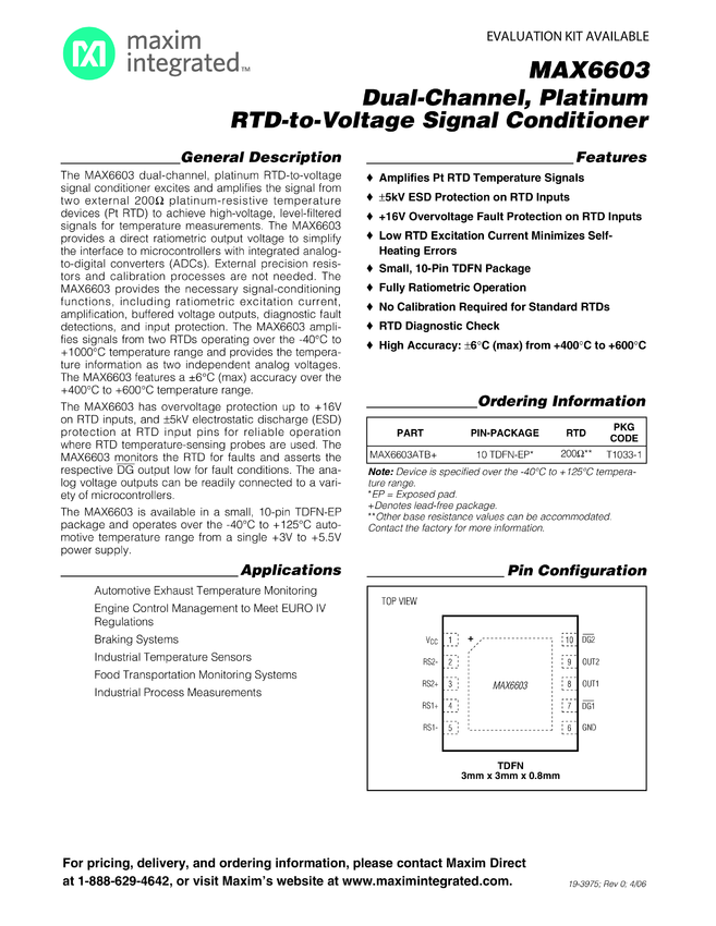 MAX6603 Dual-Channel, Platinum, RTD-to-Voltage Signal Conditioner