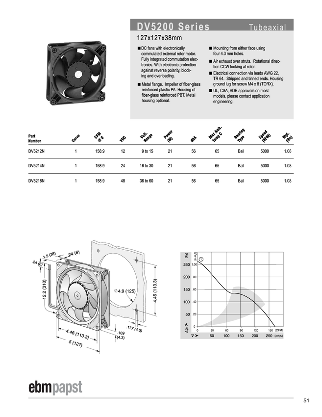 Wentylator 24V DC, 20,4W; 127 x 127 x 38 mm' 270 m3/h 5000 obr / min; DV ebm-Papst; 56 dB(A); łożysko kulkowe seria DV